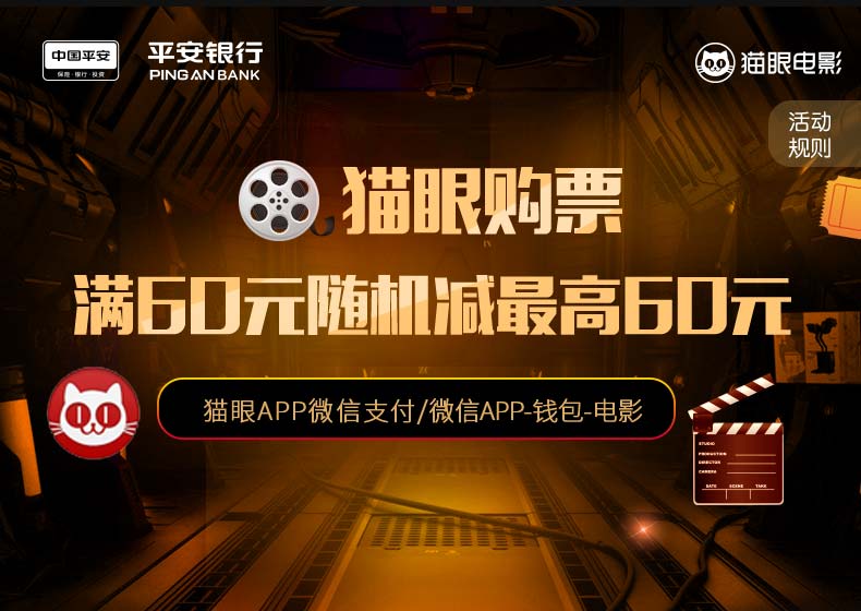 活动日期:2018/11/6-2019/3/6 活动内容: 活动期间,在猫眼APP或微信APP(钱包-电影演出赛事) 使用平安信用卡微信支付,单笔消费满60元即享1-60元 随机立减优惠。